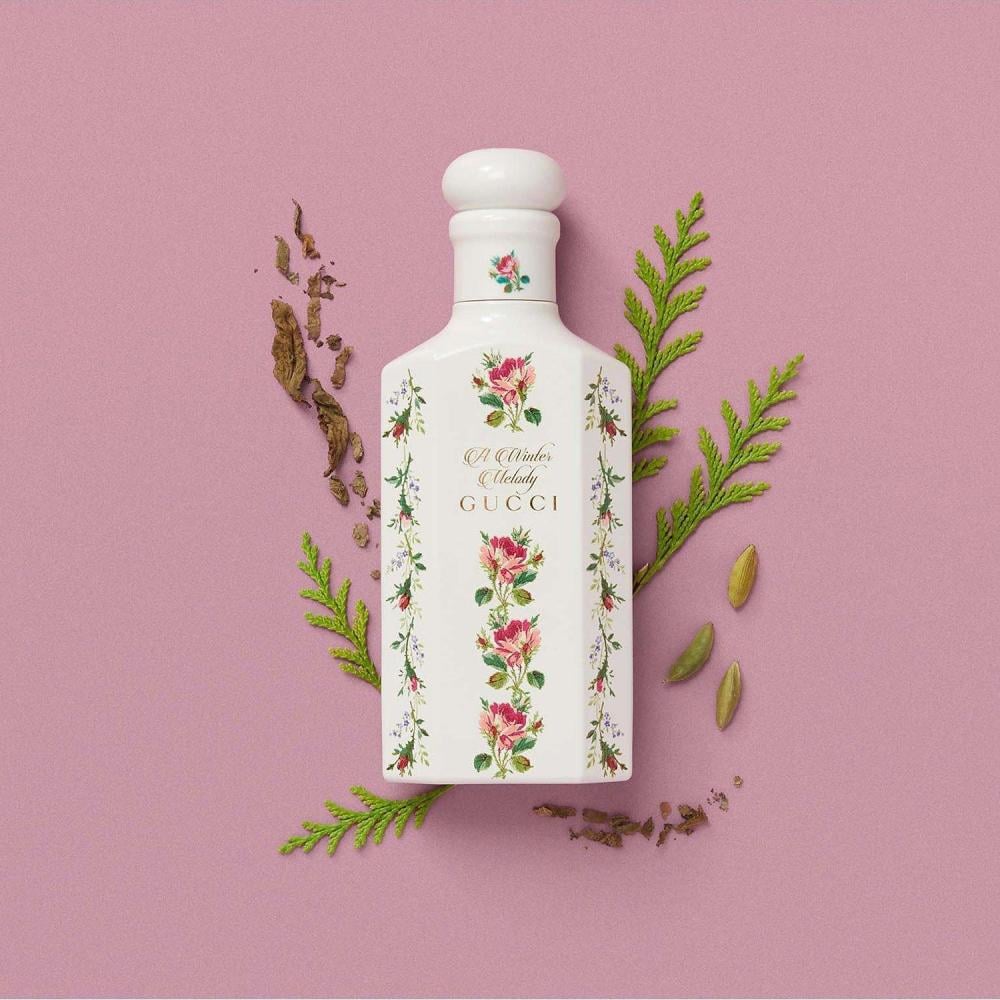 يعتبر عطر A Winter Melody Acqua Profumata جزءًا من أول خط عطور فاخرة من Gucci، The Alchemist's Garden. حيث قام صانع العطور الماهر Alberto Morillas بمزج مستخلص السرو ونفحات البرغموت والورد تحت إشراف Alessandro Michele، مما يخلق رائحة راتنجية ومنعشة تضفي لمسة من النضارة على العطور. يتم تقديم الماء المعطر في زجاجة زجاجية مطلية باللون الأبيض ومزينة بزخارف براعم الورد التي تشتهر بها الدار.