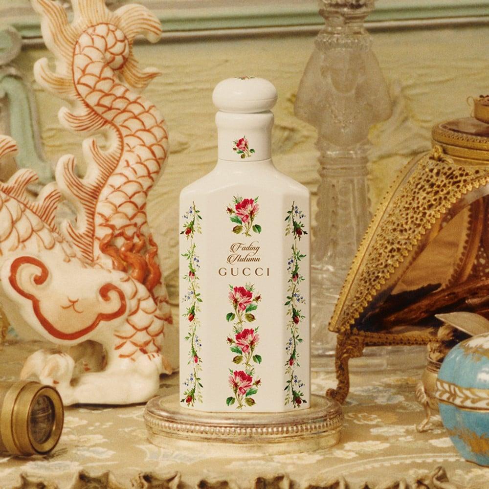 يعتبر عطر Fading Autumn Acqua Profumata جزءًا من أول خط عطور فاخرة من Gucci، The Alchemist's Garden. تم مزجه بواسطة صانع العطور الماهر Alberto Morillas تحت التوجيه الإبداعي لـ Alessandro Michele، حيث تعمل النوتات الخشبية من خشب الأرز والسيبريول والبتشولي وخشب الصندل على تعزيز ملمس العطور. يتم تقديم الماء المعطر في زجاجة زجاجية مطلية باللون الأبيض ومزينة بزخارف براعم الورد الرمزية للدار.