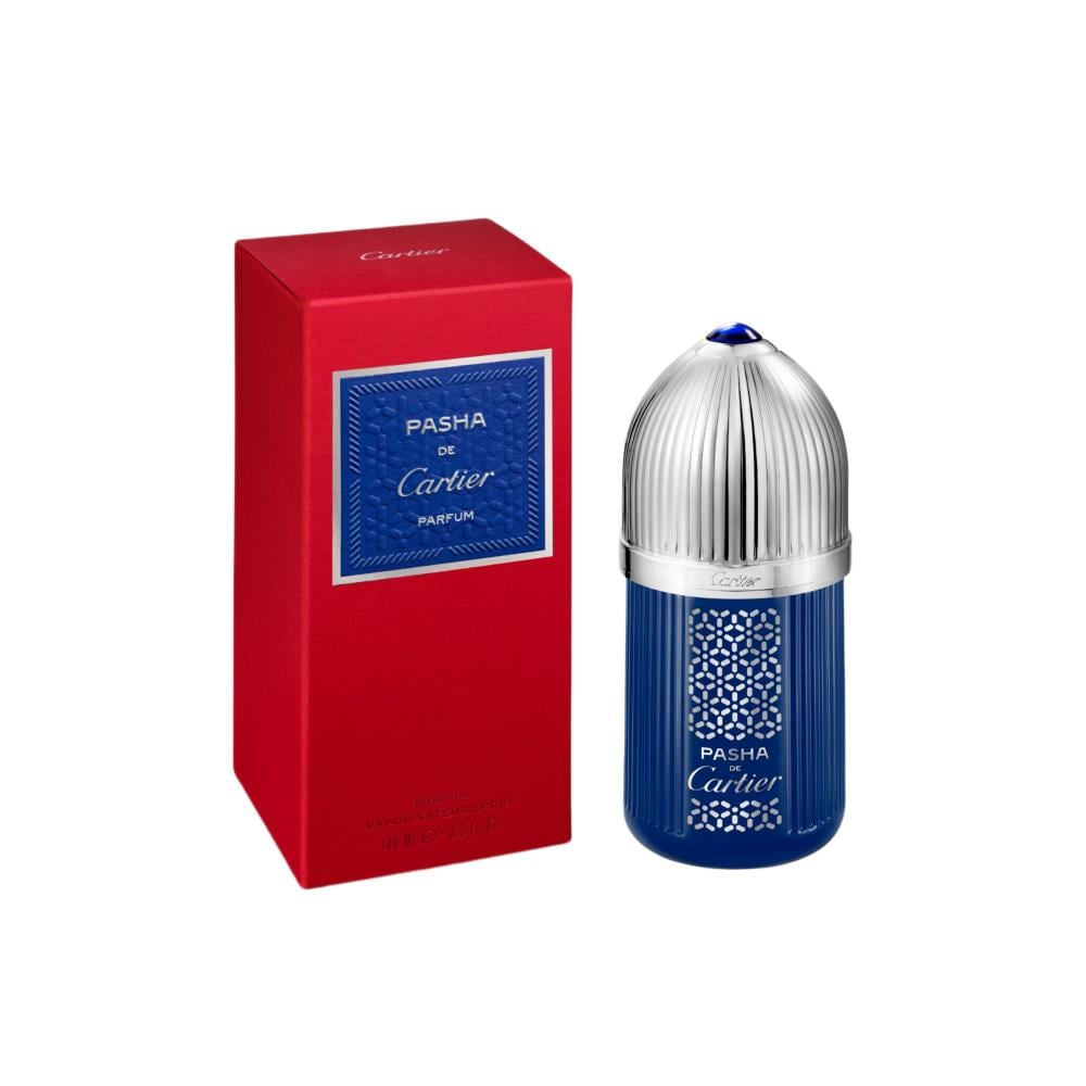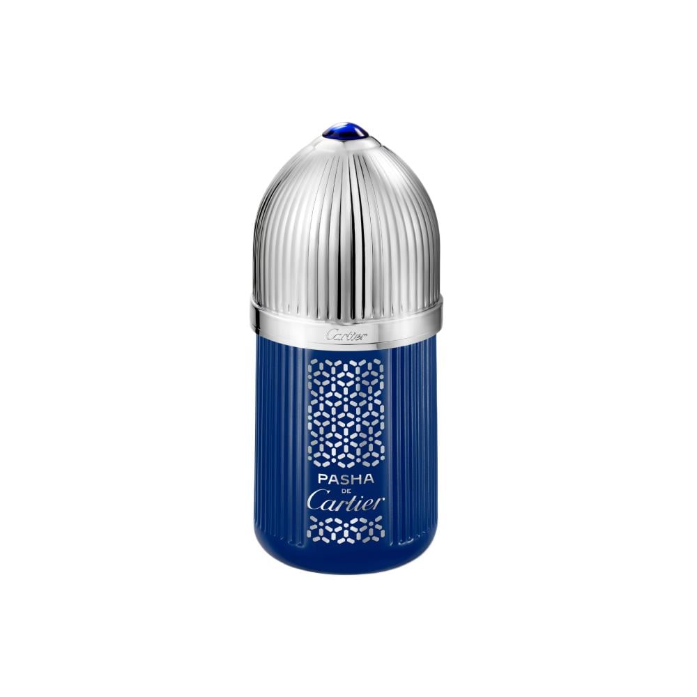 “Pasha de Cartier” perfume appears in a limited edition bottle characterized by its deep blue color that recalls the cabochon of the famous watch from the house. The bottle is decorated with Arabic motifs from the house’s archives to play with light reflections.